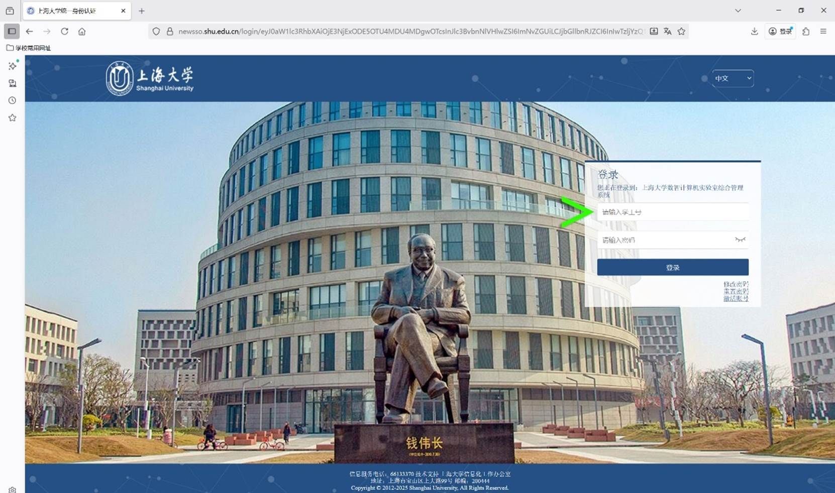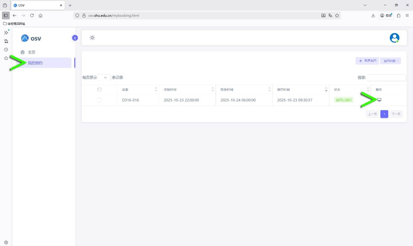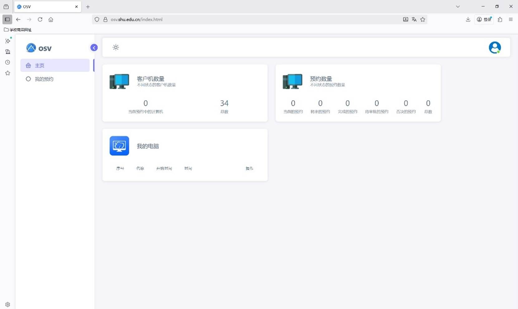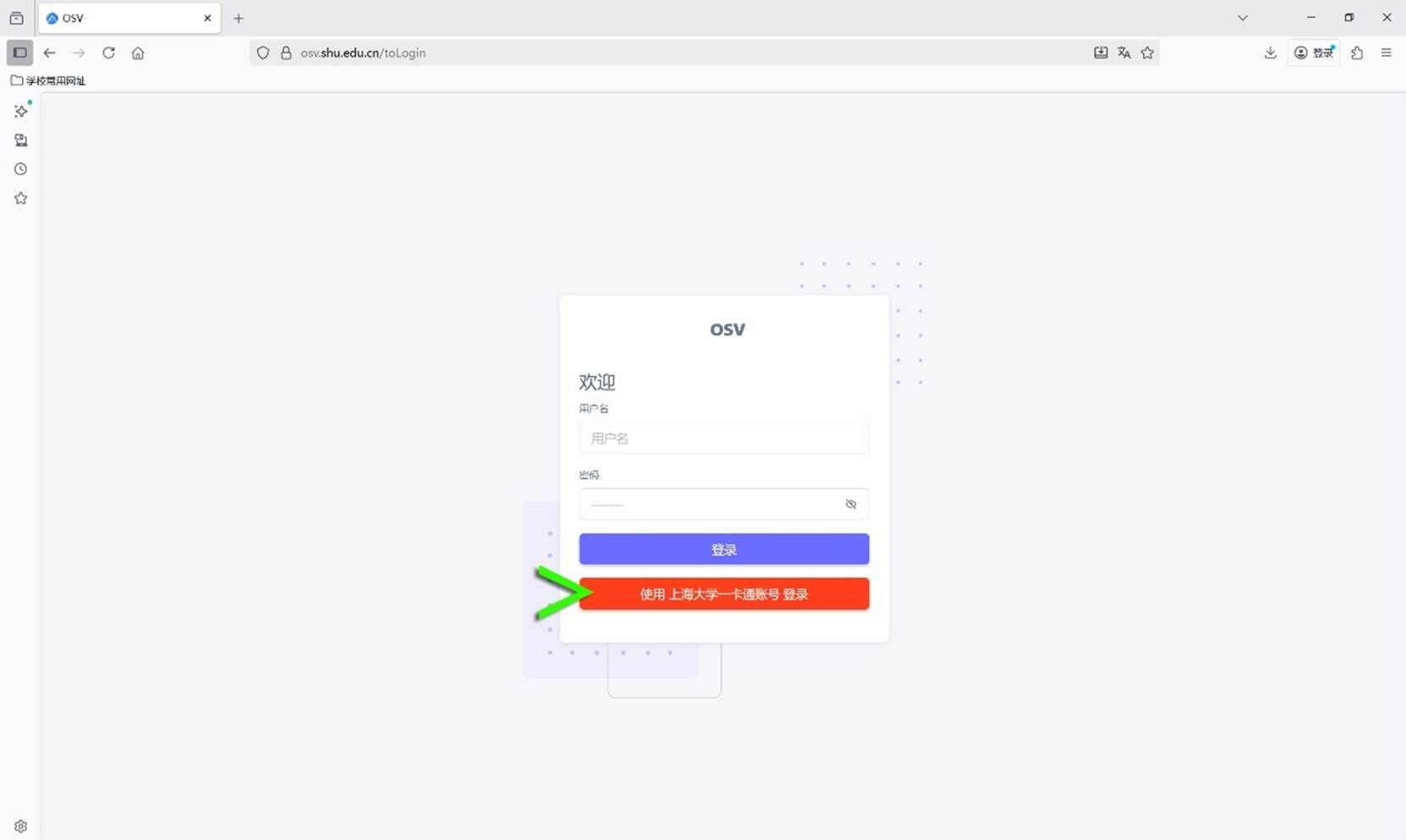 通过简洁高效的开放流程,体现了提质增效的目标,极大地减少了管理成本,提升了师生使用体验和设备使用效率。 五、 线上预约具体步骤 打开浏览器,输入网址: https://osv.shu.edu.cn ,校内用户点击使用上海大学一卡通账号登录: