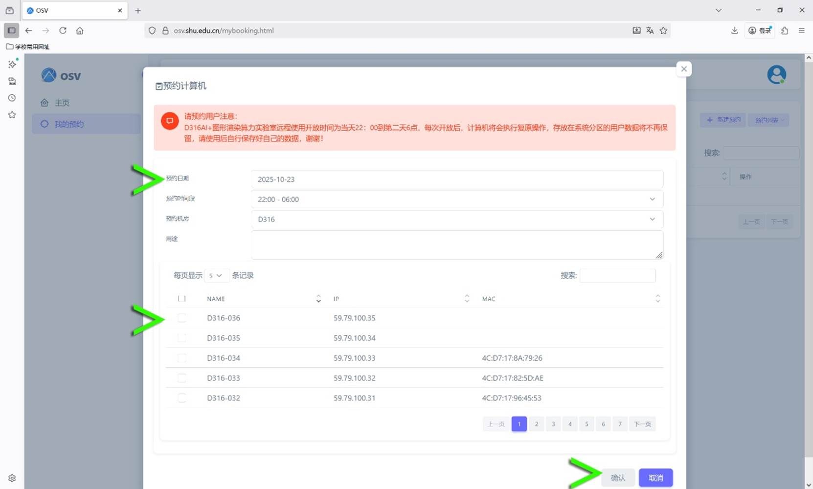 新建预约后,在此界面依次选择或填写:预约日期、预约时间段、预约机房、用途,选择需要预约的计算机编号,最后点击确认。