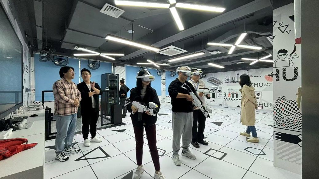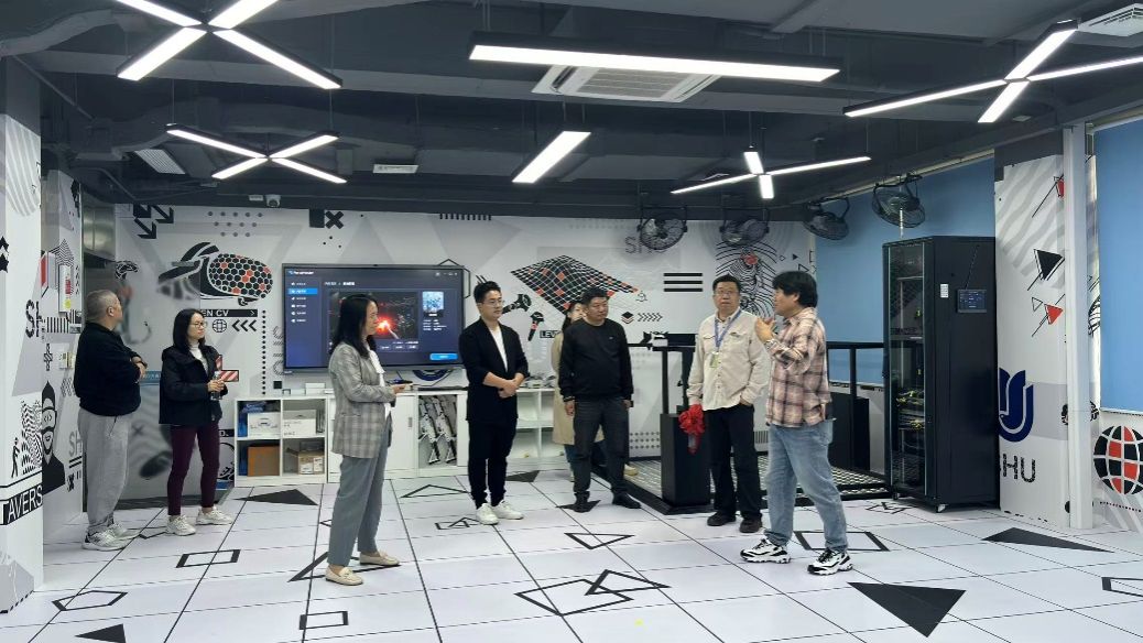 行程的最后一站是本次调研的重点——虚拟仿真实验中心。在这里,中心老师向来宾重点展示并讲解了中心的沉浸式虚拟仿真教学环境、LBE大空间交互系统以及丰富的虚拟仿真教学项目。三位老师亲身体验了虚拟仿真技术在复杂场景模拟等方面的创新应用,并就特色实验室的“共享共建”模式、资源整合路径以及与衡南公司的校企合作方式,与中心老师进行了卓有成效的探讨。
