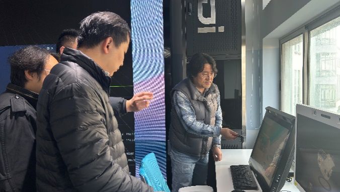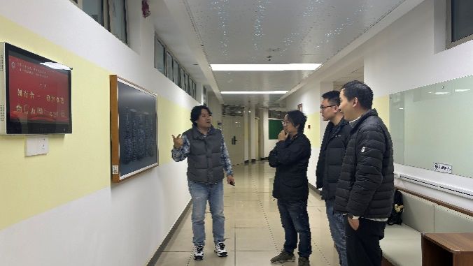 会后,来宾在陈章进、单子鹏与朱俊老师的陪同下,实地参观了C322虚拟仿真沉浸式体验教学实验室,观看演示并体验了直播录播系统、头显设备、3D互动设备、裸眼3D设备等;在C327来宾重点考察了AI+虚拟现实空间扩展交互平台、模型渲染算力支持系统等核心设施,充分肯定了该实验室在支撑新型学科交叉建设方面所展现的创新价值与示范作用;以及虚仿中心走廊环境的设计理念、配套外宣设计品等,来宾高度评价了中心所营造的沉浸式教学环境以及“文化+科技”“艺术+技术”“理论+实践”融合的建设理念。