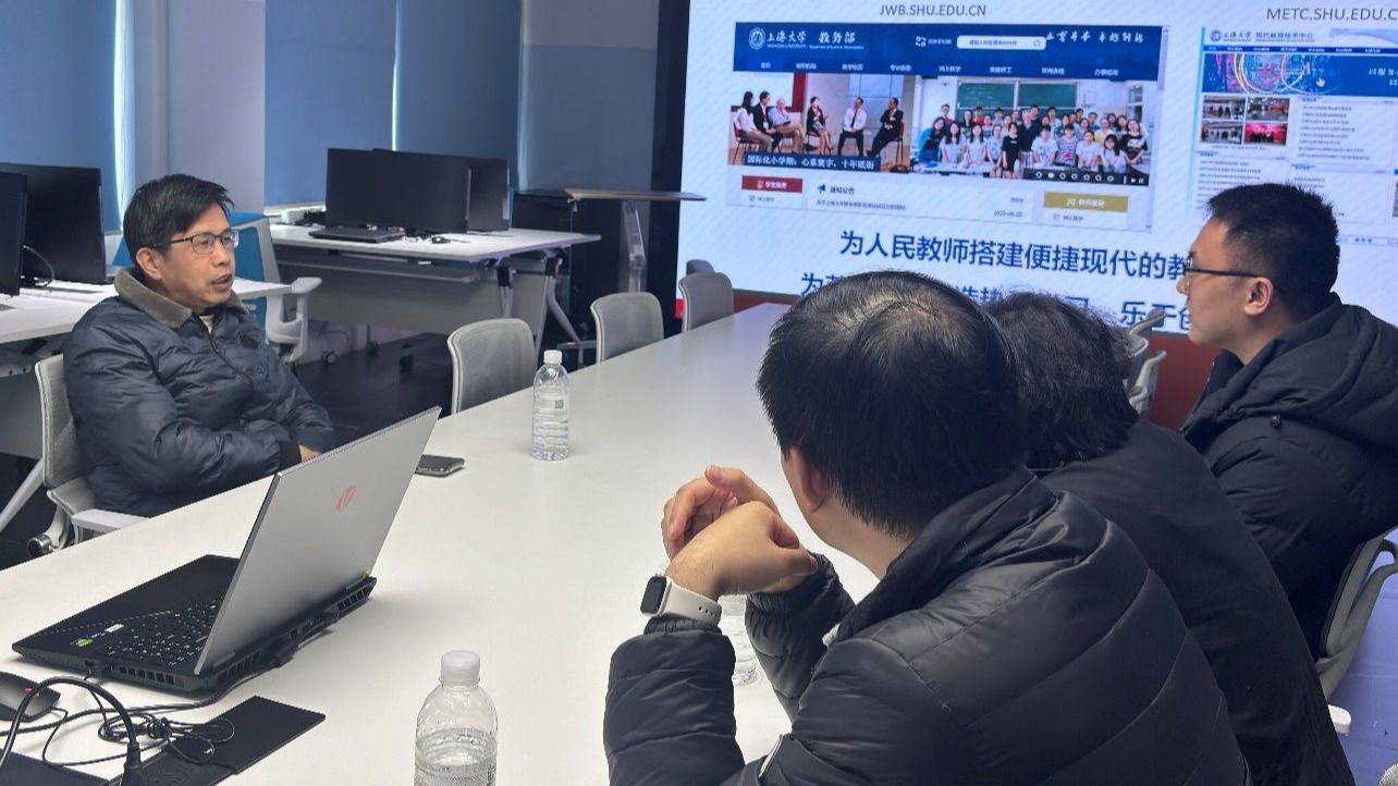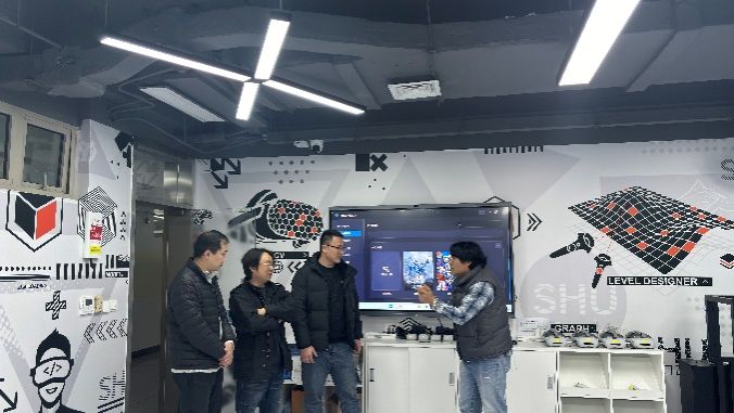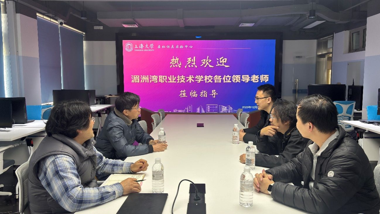 2025年12月30日,湄洲湾职业技术学校副校长李光率中层管理团队一行来访上海大学虚拟仿真实验中心,围绕虚拟现实、数字媒体等专业领域,专项调研我校虚拟仿真实验教学中心的建设、管理及校企协同育人机制。教育技术中心主任陈章进、实验室负责人单子鹏及虚仿中心现场负责人朱俊接待了来访嘉宾。双方在宝山校区虚拟仿真中心C329实验室举行专题研讨会,并进行了实地参观。